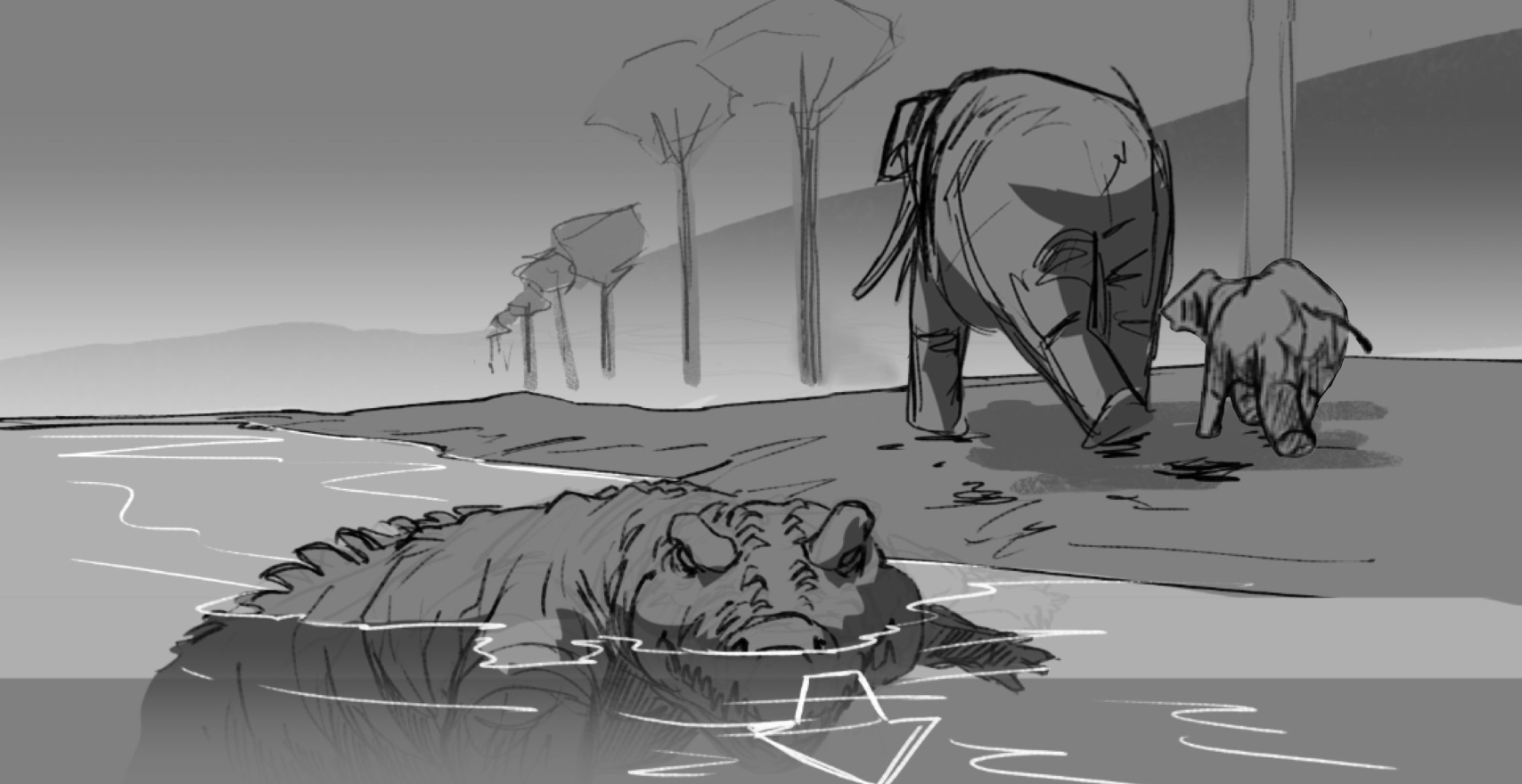 The Stegotetrabelodon is a prehistoric elephant discovered in what is now the UAE, a direct link between the region and deep geological time. When this animal walked here, it was not desert but floodplain: wet, ecologically dense, unrecognisable as the same landscape. We worked with the museum's experts to reconstruct that world accurately, right down to the flora of the era. The characters were built from 3D scans of the physical models in the exhibition, then optimised and rigged for mobile. The scene follows a mother and cub walking along a riverbed. The youngster stops to drink, unaware of a crocodile approaching from the water. The mother notices, moves to confront the threat, and the crocodile retreats. That river is also present in the real exhibition: a glass floor traces the room and corridor, a physical echo of the waterway the animals move beside.